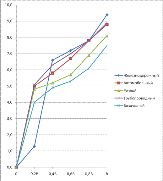 · при заданных условиях, при выделении ассигнований в размере «В» максимальный эффект достигается при распределении 0,4В на железнодорожный вид транспорта, ничего на воздушный вид транспорта и по 0,2В на остальные виды транспорта;