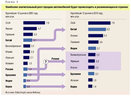 Уже сейчас по количеству продаваемых автомобилей Россия занимает шестое место в Европе; в ближайшие десять лет она вполне может догнать рынки второго уровня — Францию, Италию и Великобританию, уступая только Германии. Объем российского рынка, вероятно, достигнет 2,6 млн единиц в год. Это европейское проявление глобальной тенденции: мировой рынок автомобилей будет расти за счет развивающихся рынков (см. схему 1). Однако, несмотря на благоприятные в целом перспективы развития рынка, у российских производителей легковых автомобилей немало проблем: объемы производства не растут, прибыли падают, нужны большие инвестиции в разработку новых моделей и приобретение новых технологий, давно назрели масштабные преобразования на предприятиях. Иностранные компании тем временем наращивают свое присутствие на российском рынке.