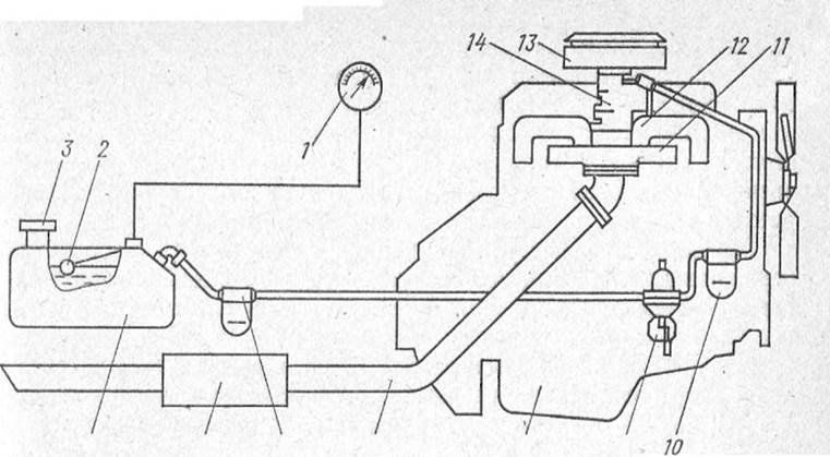 На рис. 40 приведена принципиальная схема системы питания автомобильного карбюраторного двигателя 8. Топливо из бака 4, закрытого пробкой 3, подается насосом 9 по трубопроводам к прибору приготовления горючей смеси — карбюратору 14, проходя очистку в фильтре-отстойнике 6 и фильтре 10 тонкой очистки топлива. Количество топлива в баке контролируют по указателю 1, в электрическую цепь которого включен датчик 2. Воздух поступает в карбюратор через воздушный фильтр 13. Приготовленная в карбюраторе горючая смесь