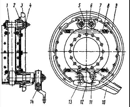Разжимной кулак 12 вращается в кронштейне 10, прикрепленном к суппорту болтами. На этом кронштейне устанавливается тормозная камера. На конце вала разжимного кулака установлен регулировочный рычаг 14 червячного типа, соединенный со штоком тормозной камеры при помощи вилки и пальца. Щиток, прикрепленный болтами к суппорту, защищает тормозной механизм от грязи.