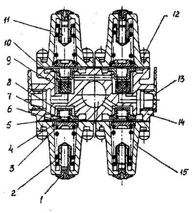 При торможении колодки раздвигаются S-образ-ным кулаком 12 и прижимаются к внутренней поверхности барабана. Между разжимным кулаком 12 и колодками 7 установлены ролики 13, снижающие трение и улучшающие эффективность торможения. В отторможенное состояние колодки возвращаются четырьмя оттяжными пружинами 8.