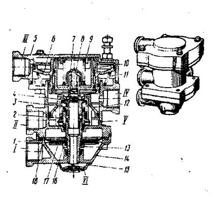 17 - шайба мембраны; 18 - корпус средний; I - вывод к секции тормозного крана;