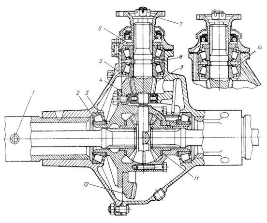 Картер — литой разъемный в вертикальной плоскости. В обе половины картера запрессованы кожуха полуосей и дополнительно закреплены электрозаклепками. Ведущая шестерня главной передачи установлена на двух подшипниках сдвоенном коничecком роликовом подшипнике 10, расположенном в горловине картера, и роликовом цилиндрическом 4, расположенном в приливе картера. Между торцом наружного кольца сдвоенного коннческого подшипника и картером установлено регулировочное кольцо 5 положения ведущей шестерни. Сдвоенный конический подшипник регулируется пакетом 8 прокладок. Ведомая шестерня крепится к фланцу коробки сателлитов специальными болтами. Дифференциал конический с четырьмя сателлитами. Коробка сателлитов разъемная, состоит из двух половин, соединенных болтами. Шестерни полуосей дифференциала имеют сменные упорные шайбы 11. Дифференциал установлен на двух конических роликовых подшипниках 2, между торцами коробки сателлитов и внутренними кольцами подшипников дифференциала установлены регулировочные прокладки. Между фланцем ведущей шестерни и сдвоенным коническим подшипником установлено маслоотгонное кольцо 6.