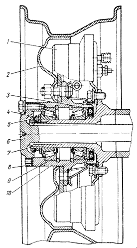 Рис. 2. Ступица заднего колеса.1 — тормозной барабан; 2 — диск колеса;3 — манжета; 4 — замочная шайба; 5 — контр-гайка; 6 — полуос; 7 — цапфа; 8 — прокладка; 9 — подшипник; 10 — ступица.