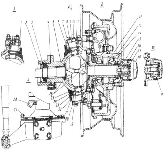 1 — рычаг поворотной цапфы; 2 — кожух полуоси; 3 — резиновая манжета в металлическом кожухе; 4 — прокладки; 5 — шаровая опора; 6 — корпус поворотной цапфы; 7 —& nbsp;опорная шайба; 8 — накладка шкворня; 9 — шкворень; 10 — пресс масленка; 11 — стопорный штифт; 12 — цапфа; 13 — ступица колеса; 14 — ведущий фланец; 15 — муфта отключения колес; 16 — болт муфты; 17 — шарик фиксатора; 18 — защитный колпак; 19 — втулка шкворня; 20 — прокладки; 21 — внутреннее кольцо сальника; 22 — кольцо-перегородка; 23 — наружное кольцо; 24 — резиновая манжета; 25 — наружное уплотнительное войлочное кольцо; 26 — упорные шайбы; 27 — регулировочный болт ограничения поворота колеса; 28 — упор-огранитель поворота колеса; I — правый поворотный кулак; II — левый поворотный кулак; III — ступицы передних котес отключены; а — сигнальная канавка.