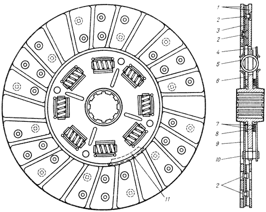 Рис.5. Ведомый диск. 1 - фрикционные накладки; 2 - заклепки;3 - пружина ведомого диска; 4 - пластина демпфера;5 - демпферная пружина;6 - ступица; 7 - фрикционные кольца;8 - регулировочные кольца;9 - ведомый диск;10 - упорный палец;11 - балансировочный грузик;
