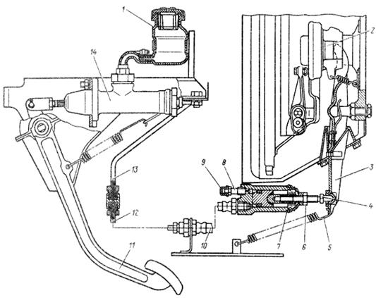 1 - бачок; 2 - муфта выключения сцепления; 3 - вилка выключения сцепления; 4 - толкатель; 5 - оттяжная пружина; 6 - контргайка; 7 - рабочий цилиндр; 8 - клапан прокачки; 9 - колпачок; 10 - гидравлический шланг; 11 - педаль; 12 и 13 - гидравлические трубки; 14 - главный цилидр.