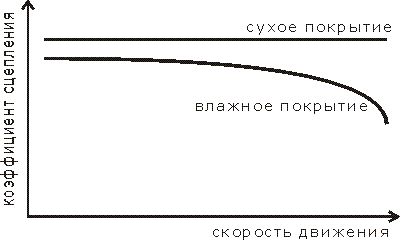 На сухом покрытии величина коэффициента сцепления практически не зависит от скорости движения автомобиля. На влажных покрытиях величина коэффициента сцепления уменьшается с увеличением скорости. Характер взаимосвязи между скоростью движения и величиной коэффициента сцепления показан на рисунке.