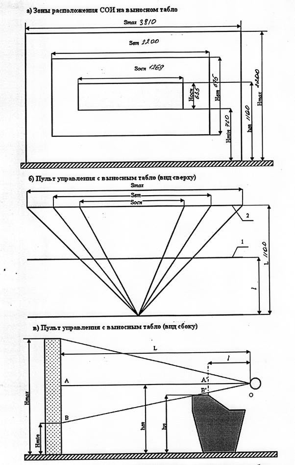 На вертикальной панели – выносном табло – располагается мнемосхема станции, содержащая большое число СОИ. При этом, весьма важно рассчитать размеры табло таким образом, чтобы обеспечить нормальные условия восприятия информации. Нижняя граница табло определяется с таким расчетом, чтобы пульт управления не закрывал расположенные на табло СОИ. Горизонтальная панель используется для размещения ОУ.