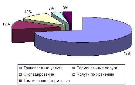 В 2009г. расчетная емкость рынка грузоперевозок Москвы достигла 158,3 млрд. руб., что составляет порядка 20% от рынка услуг всех грузоперевозок России. На долю транспортно-экспедиторских услуг приходится 72% от общего объема транспортно-логистического рынка Москвы, 12% занимают услуги терминалов, по 3% составляют услуги по хранению и таможенному оформлению грузов.