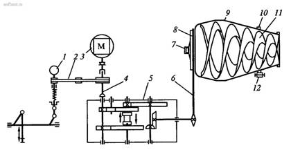 На внутренней поверхности барабана укреплены две спиральные лопасти 11, угол наклона которых подобран таким образом, что при вращении в одном направлении компоненты смеси попадают в нижнюю часть барабана, где происходит их гравитационное перемешивание, а при вращении в обратную сторону лопасти подают готовую смесь к приемному лотку, соединенному с поворотным разгрузочным желобом. Вращение барабану 9 сообщается от индивидуального дизельного двигателя 3 через реверсивный зубчатый редуктор 5 и цепную передачу 6, ведомая звездочка к которой жестко прикреплена к сферическому днищу барабана, опирающегося спереди на раму шасси центральной цапфой 7, а сзади - гладким бандажом 10 на опорные ролики 12, установленные на шарикоподшипниках. Привод обеспечивает две частоты вращения барабана в обе стороны при загрузке, перемешивании и разгрузке. Частоту вращения при загрузке выбирают в зависимости от производительности питающей установки. Приготовление смеси в пути следования производят при дальности транспортировки не более 10...15 км, при этом отдозированые компоненты в смесительный барабан загружают одновременно. При перевозках на большие расстояния в барабан загружают сначала сухие компоненты (цемент и заполнители), а подачу воды и приготовление смеси производят непосредственно на объекте. Заданная порция воды подается в смесительный барабан из дозировочно-промывочного бака центробежным насосом 1 через сопло в загрузочной воронке. Через то же сопло производится промывка барабана водой после разгрузки. Привод насоса осуществляется от двигателя 3 через карданный вал 4 и клиноременную передачу 2. При транспортировке готовой бетонной смеси во избежание ее расслаивания барабан вращается с пониженной частотой, непрерывно перемешивая смесь.