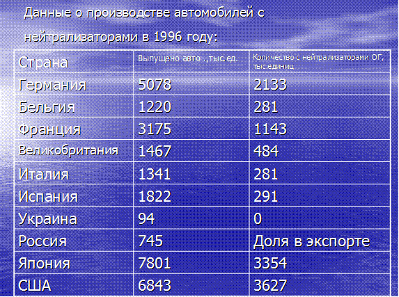 А теперь ребята, давайте подведём итоги. Вы показали презентации по основным направлениям развития и совершенствования автотранспорта, решали проблему создания экологически чистого автомобиля, сделали много полезных выводов и рекомендаций. В заключении я прошу сделать выводы о перспективах развития и появления экологически чистого автомобиля. От каждой группы принимается устный ответ и оценивается.