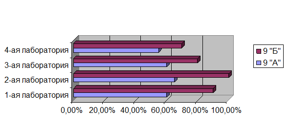 Итоги эксперимента. Проведено 2 эксперимента. То есть мы увидели 2 выставки экологически чистого транспорта. Исследуемые группы имели разный уровень подготовки. В первой группе (9 «Б» класс) выставке предшествовала 4-х недельная подготовка, во второй группе (9 «А» класс) предварительной подготовки не было, для выставки они использовали материалы, разработанные предыдущими участниками, отсюда и разница в качестве урока.Степень заполнения рабочего листа показана на гистограмме 1. Как видно из диаграммы наиболее полно и качественно свои рабочие листы заполнили учащиеся 9 «Б» класса. Таким образом, можно сделать вывод: качество работы на уроке зависит от уровня предварительной подготовки учащихся.