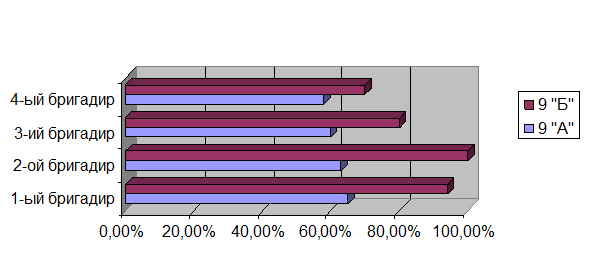 гистограмма 1Произведено сравнение уровня подготовки бригадиров (подготовка и поиск материала, умение распределить материал внутри группы, степень самостоятельной подготовки, т.д.).