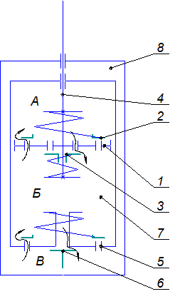 1 – поршень, 2 – клапан сжатия, 3 – клапан отбоя, 4 – шток, 5 – перепускной клапан отбоя, 6 – перепускной клапан сжатия, 7 – рабочий цилиндр, 8 – резервуар, А – надпоршневое пространство, Б – подпоршневое пространство, В – полость резервуара