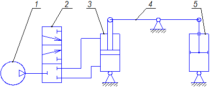 1 – компрессор, 2 – распределитель, 3 – пневмоцилиндр, 4 – рычаг, 5 - амортизатор