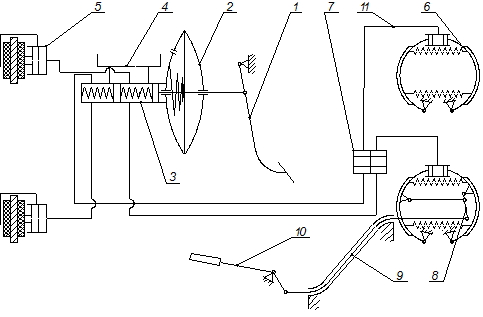 1 – педаль, 2 – вакуумный усилитель, 3 – главный тормозной цилиндр, 4 –бачок, 5 – передние тормозные механизмы (дисковые), 6 – задние тормозные механизмы (барабанные), 7 – регулятор тормозных сил, 8 – механизм стояночного тормоза, 9 – трос, 10 – рычаг стояночного тормоза, 11 - трубопроводы