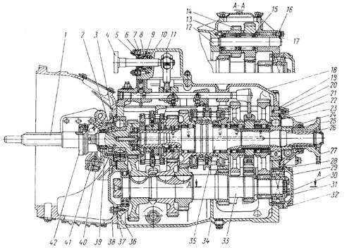 Рис. 1. Коробка передач модели 14: 1 - вал ведущий; 2 - крышка заднего подшипника ведущего вала; 3, 23 - прокладки регулировочные; 4 - шток рычага: 5 - кольцо защитное; 6 - крышка опоры рычага; 7 - сухарь опоры рычага; 8 - кольцо уплотнительное; 9 - опора штока; 10 - пружина; 11 - опора рычага переключения передач; 12 - ось блока шестерен заднего хода; 13, 31 - шайбы упорные; 14 –блок шестерен заднего хода; 15 - роликовый подшипник; 16 - болт со штифтом; 17 – шайба стопорная; 18 - крышка верхняя; 19, 32, 36 - прокладки уплотнительные; 20 - крышка заднего подшипника ведомого вала; 21 - кольцо стопорное; 22 - шариковый подшипник задний ведомого вала; 24 - червяк привода спидометра; 25, 39 - манжеты уплотнительные; 26 - гайка крепления фланца; 27 - фланец крепления карданного вала; 28 - стакан заднего подшипника промежуточного вала; 29 - крышка подшипника; 30 - роликовый подшипник сферический; 33 - вал промежуточный; 34 - картер коробки передач; 35 - вал ведомый; 37 - крышка переднего подшипника промежуточного вала; 38 - картер сцепления; 40 - вилка выключения сцепления; 41 - вал вилки выключения сцепления; 42 - муфта выключения сцепления.