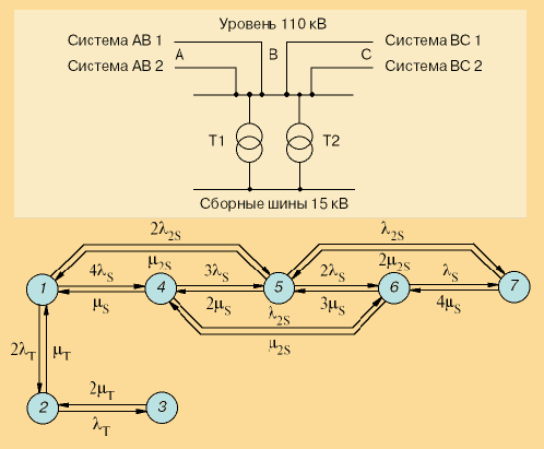 Тяговые подстанции являются системами, которые могут иметь различные состояния с точки зрения работоспособности. Они считаются также классифицированными по мощности системами. Если параметр мощности рассматривать для подстанции как случайную величину, это означает способность данного объекта обеспечивать определенную мощность при соблюдении заданной технологии. Важными параметрами при этом являются также максимальная и мгновенная мощность. Определение интересных с этой точки зрения величин, характеризующих надежность, возможно только с помощью модели Маркова. В дальнейшем рассмотрении для упрощения принимается, что тяговая подстанция считается полностью работоспособной, если в рабочем состоянии находится хотя бы один фидер.