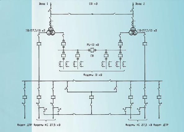 Рис. 3 Общий вид электрифицированной железной дороги постоянного тока и питающих её устройств