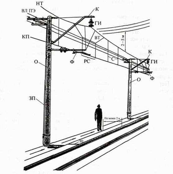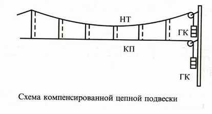 Несущий трос; (НТ) подвески крепится через гирлянду изоляторов (ГИ) к консоли (К), закрепленной на опоре (О). Контактный провод (КП) с помощью струнок (С) подвешивается к НТ. Конструкция струнок вместе с другими устройствами должна обеспечить беспровесное положение КП. С помощью фиксаторов (Ф) контактный провод фиксируется на консолях опор.