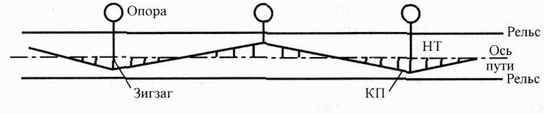 Наибольшее распространение получила полукосая подвеска, у которой КП расположен зигзагообразно относительно оси пути, а НТ — над осью пути. Нормальный зигзаг на прямых участках пути составляет 300 мм. Зигзаги, направленные от опор, называются плюсовыми, а к опорам — минусовыми. Полукосая подвеска обеспечивает равномерный износ пластин токоприемника ЭПС благодаря поперечному смещению КП относительно средней точки токоприемника в процессе движения ЭПС.