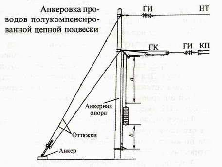 В полукомпенсированной цепной подвеске несущий трос анкеруется на анкерной опоре жестко, а контактный провод — через грузовые компенсаторы.
