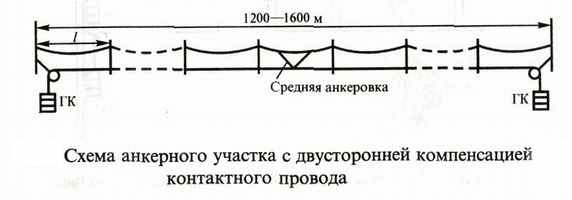 Подвеску разбивают на отдельные анкерные участки длиной 1200—1600 м, контактные провода которых механически не связаны между собой. Контактный провод в конце каждого участка закрепляют (анкеруют) на анкерных опорах, несущие тросы могут анкероваться через 7 км. При некоторой средней температуре КП располагается беспровесно и обеспечивает хороший токосъем. При изменении температуры меняется длина НТ и КП, их натяжение и стрелы провесы; условия токосъема при этом ухудшаются. Для сохранения нормального токосъема применяют несколько способов анкеровки КП и НТ на анкерных опорах.