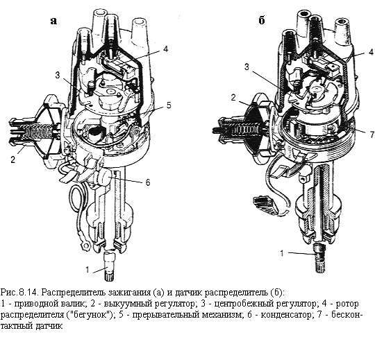 Датчики-распределители отличаются в основном тем, что у них контактный прерыватель замещен бесконтактным датчиком {микропереключателем). В бесконтактном датчике магнитоэлектрического типа число пар полюсов соответствует числу цилиндров двигателя, в датчике Холла этому числу соответствует число прорезей вращающегося магнитного экрана. Центробежный регулятор угла опережения зажигания в магнитоэлектрическом датчике поворачивает втулку с расположенным на ней ротором датчика, в датчике Холла поворачивается муфта с закрепленным на ней магнитным экраном (шторкой). Вакуумные автоматы поворачивают пластину крепления микропереключателя. Октан-корректор имеет шкалу со знаками “+” и “-” для увеличения и уменьшения угла опережения и риски, соответствующие изменению угла опережения зажигания. В последних конструкциях датчиков-распределителей, например, переднеприводных автомобилей ВАЗ, с целью повышения точности установки момента искрообразования привод распределителя осуществляется непосредственно от распределительного вала двигателя, при этом распределитель крепится на головку блока цилиндров двигателя.
