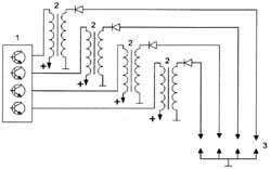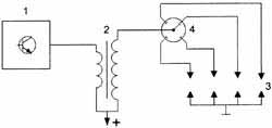 1 - коммутатор; 2 - катушка зажигания; 3 - свечи зажигания; 4 - механический распределитель