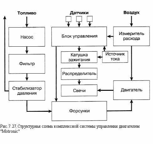 "Mono-Jetronic" система впрыска управляемая электронным блоком управления, рис.1 . Система имеет одну на весь двигатель (греч. монос — один) магнитоэлектрическую форсунку, топливо, как и в системах "L-Jetronic", впрыскивается с интервалами.