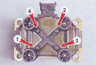 Возможно исполнение распределителя как неотъемного элемента конструкции самого двигателя. В этом случае ротор закрепляется непосредственно на распределительном валу. В контактных и бесконтактных системах зажигания реализован динамический принцип распределения высокого напряжения (рис. 1а). Высокое напряжение с катушки зажигания через механический распределитель подается на свечу определенного цилиндра. Механический распределитель имеет привод от распредвала. А таких системах используется одна катушка зажигания. В электронной системе зажигания используется принцип статического распределения высокого напряжения, то есть в системе отсутствуют подвижные детали. На всех впрысковых вазовских автомобилях, выпускавшихся до настоящего времени, высокое напряжение с катушки зажигания подается в два цилиндра, поршни которых в данный момент движутся к верхней мертвой точке. В одном из цилиндров происходит такт сжатия смеси, во втором — такт выпуска. Такой принцип распределения высокого напряжения называется “методом холостой искры” (рис. 1б). Для реализации этого принципа на четырехцилиндровом двигателе требуются две катушки зажигания. На перспективных шестнадцатиклапанных двигателях планируется устанавливать индивидуальные катушки зажигания на каждый из цилиндров (рис. 1в).