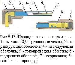 Высоковольтные провода подразделяются на обычные с металлическим центральным проводником и специальные с распределенными параметрами, обеспечивающие подавление радиопомех.