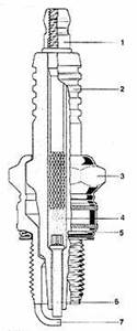 Рис. 1. Свеча зажигания: 1 — контакт; 2 — изолятор; 3 — корпус; 4 — электропроводное стекло; 5 — уплотнение; 6 — центральный электрод; 7 — боковой электрод