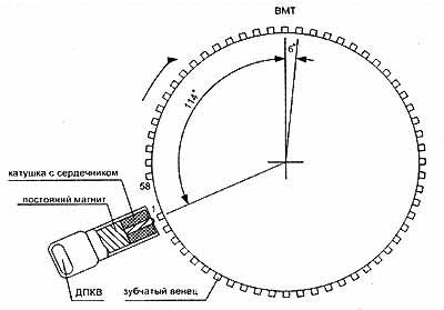 Чтобы обеспечить оптимальное управление двигателем, контроллер системы управления должен всегда знать точное положение поршней в цилиндрах двигателя относительно ВМТ. Для этой цели шкив привода генератора дополнили зубчатым венцом (рис. 2). Расчетное количество зубьев на венце 60, при этом два из них отсутствуют. Угловое расстояние между зубьями составляет 6о. В паре с зубчатым шкивом работает ДПКВ, установленный на кронштейне крышки масляного насоса. Воздушный зазор между ДПКВ и зубчатым венцом составляет 0,7—1,1 мм. Датчик состоит из постоянного магнита и обмотки с сердечником. При вращении зубчатого венца изменяется магнитный поток в магнитопроводе датчика, наводя импульсы напряжения переменного тока в его обмотке. Амплитуда импульсов увеличивается с ростом частоты вращения коленвала. На величину амплитуды импульсов влияет также расстояние между датчиком и зубчатым венцом. Шкив установлен на валу так, что при совмещении середины первого зуба венца с осью ДПКВ поршни первого и четвертого цилиндров находятся строго за 114о до ВМТ. С началом прокрутки двигателя контроллер анализирует сигнал ДПКВ, пытаясь выделить два пропущенных зуба на венце шкива (после пропущенных идет первый зуб). Как только это происходит (контроллер засинхронизировался), становится возможным расчет угла опережения зажигания, расчет фаз впрыска топлива и управление модулем зажигания и форсунками (рис. 3). Сигнал ДПКВ используется также для расчетов скорости вращения коленвала и его ускорения.