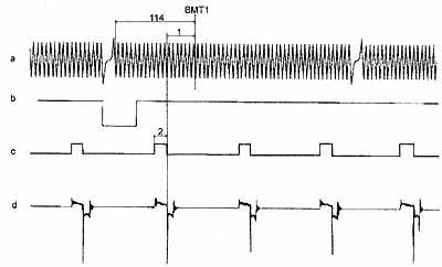 Рис 3: а — сигнал датчика положения коленчатого вала; b — сигнал датчика фаз; с — сигнал управления с контроллера на модуль зажигания; d — напряжение во вторичной цепи модуля зажигания; ВМТ1 — верхняя мертвая точка первого цилиндра на такте сжатия; 1 — угол опережения зажигания; 2 — время накопления энергии в катушке зажигания