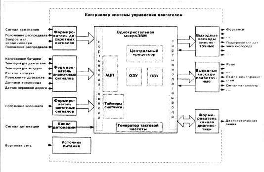 Главная часть системы впрыска — контроллер системы управления двигателем. Контроллер (от английского control — “управление”) является коммуникационным и вычислительным центром системы — в зависимости от сигналов датчиков, по заранее определенным алгоритмам, он выдает управляющие воздействия на исполнительные устройства системы управления.