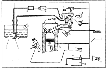 1 — топливный бак, 2 — толивоподающий насос, 3 — топливный насос, 4 — топливный фильтр, 5 — узел центральной форсунки, 6 — регулятор холостого хода с шаговым электродвигателем, 7 — потенциометр дроссельной заслонки, 8 — лямбда-зонд, 9 — электронный блок управления впрыском, 10 — датчик температуры охлаждающей жидкости, 11 — прибор коммутирующий сигнал информации о частоте вращения коленчатого вала двигателя получаемый из системы зажигания, 12 — выключатель зажигания, 13 — аккумуляторная батарея, 14 — датчик-распределитель
