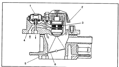 1 — регулятор давления топлива, 2 — датчик температуры всасываемого воздуха, 3 — электромагнитная форсунка, 4 — корпус форсунки и регулятора, 5 — корпус дроссельной заслонки, 6 — дроссельная заслонка