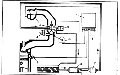 1 — измеритель расхода воздуха, 2 — форсунка, 3 — блок электронного управления, 4 — клапан добавочного воздуха, 5 — датчик положения дроссельной заслонки (потенциометр), 6 — регулятор давления топлива в системе, 7 — топливный фильтр, 8 — топливный насос, 9 — датчик температуры охлаждающей жидкости