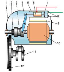 Рис.1 Схема системы пуска двигателя а) стартер выключен 1 - корпус стартера; 2 - вал якоря стартера; 3 - шестерня привода с муфтой свободного хода; 4 - рычаг привода шестерни; 5 - обмотки тягового реле; 6 - якорь тягового реле; 7 - контактная пластина; 8 - контактные болты; 9 - обмотки стартера; 10 - якорь стартера; 11 - коленчатый вал двигателя; 12 - зубчатый венец маховика