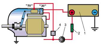 Рис. 1 Схема системы пуска двигателя в) схема электрической цепи стартера 1 - аккумуляторная батарея; 2 - предохранитель; 3 - замок зажигания; 4 - реле стартера