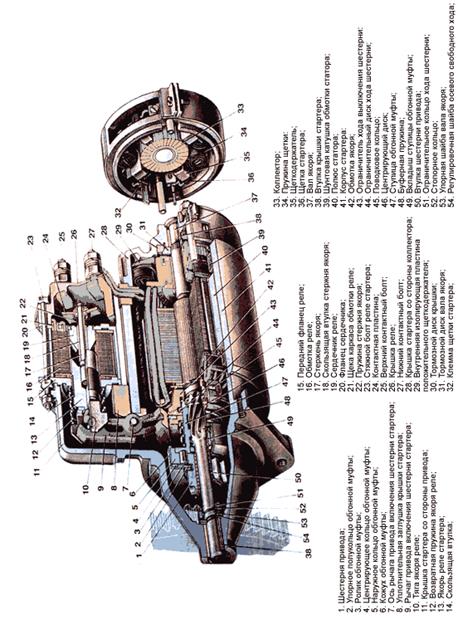 Неисправности стартера. К основным неисправностям стартера относятся ослабление крепления подводящих проводов, изнашивание или загрязнение щеток и коллектора, окисление контактов выключателя, обрыв или замыкание в обмотках, изнашивание деталей муфты свободного хода и зубьев шестерни. Эти неисправности приводят к тому, что стартер не работает совсем, не развивает нужные частоту вращения и мощность, при включении якорь стартера вращается, а коленчатый вал неподвижен, создается сильный шум при включении и работе стартера.