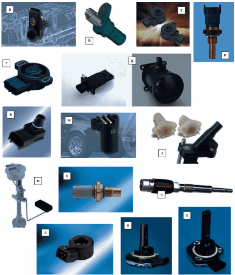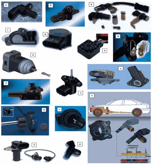 Рис. 1. Типичные примеры современных датчиков положения и скорости систем Powertrain и контроля эмиссии: а — активный датчик фазы (распределительного вала) Bosch; б — активный датчик коленчатого вала SiemensVDO; в — активные датчики скорости и положения систем контроля двигателя Honeywell; г — датчик положения дроссельной заслонки SS10459 Delphi; д — датчик положения дроссельной заслонки на основе эффекта Холла BEI; е — потенциометрический датчик положения педали 1029 Wabash (5 млн. циклов); ж — индуктивный датчик положения педали Hella; з — потенциометрический датчик положения клапана EGR Alps Automotive (5 млн. циклов); и — бесконтактный датчик линейного положения (педали и EGR) SiemensVDO; к — программируемые бесконтактные датчики углового положения SiemensVDO на основе МР-технологии; л — бесконтактный датчик углового положения на основе МР-технологии или Triaxis SiemensVDO; м — бесконтактные магнитоуправляемые датчики RFK Novotechnik; н — датчики АМР с магнитным ротором Continental Teves для коробки передач, АБС и контроля скорости двигателя; о — датчик скорости коробки передач на основе эффекта Холла, МР или ГМР SSI Technologies; п — цифровые датчики скорости Delphi; р — модульные датчики нулевой скорости MHS Honeywell