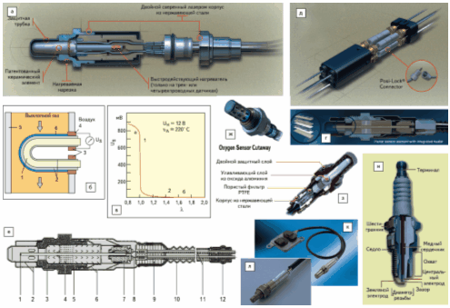 Рис. 2. Примеры современных датчиков концентрации кислорода и газа: а–в — нагреваемый датчик концентрации кислорода с твердым электролитом ZrO2 Thimble Type Oxygen Sensor Bosch; а — конструкция датчика; б — конструкция и принцип работы сенсорной ячейки: 1 — сенсорная керамика; 2 — электроды; 3 — контакт; 4 — контакт разъема; 5 — выхлопная труба; 6 — защитное пористое керамическое покрытие; в — передаточная характеристика: а — богатая смесь, б — бедная смесь; Us — сенсорное напряжение; г — планарный нагреваемый датчик концентрации кислорода Bosch; д, е — универсальный нагреваемый датчик Bosch; д — внешний вид; е — конструкция и принцип работы: 1 — сенсорный элемент (комбинация ячейки Нернста и ячейки кислородного насоса); 2 — двойная защитная трубка; 3 — уплотнительное кольцо; 4 — уплотняющая прокладка; 5 — сенсорный корпус; 6— защитная гильза; 7 — держатель контакта; 8— контактный зажим; 9 — PTFE (PolyTetraFluoroEthylene) — трубка — фильтр для очистки входного кислорода от воды и загрязнений; 10 — PTFE-сформованная гильза; 11 — 5 соединительных проводов; 12 — уплотнение; ж, з— датчики концентрации кислорода Denso; з — датчик широкого диапазона; и — датчики на основе TiO2 (иллюстрация с сайта www.sparkplugs.com); к, л —датчики газа NOx и соотношения воздух/топливо SiemensVDO и NGK Spark Plugs.