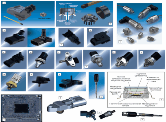 Рис. 4. Примеры автомобильных датчиков давления (систем Powertrain и контроля эмиссии): а — датчик MAP Bosch с микромеханической сенсорной ячейкой; б — интегральный кремниевый пьезорезистивный датчик MAP Bosch; в–н — датчики давления Kavlico Corporation: в — датчик абсолютного давления MAP Kavlico (слева) и датчик SiemensVDO (справа) абсолютного давления MAP-TMAP; г — полностью погружаемый датчик давления трансмиссионных жидкостей с пьезорезистивным элементом; д — датчик дифференциального давления для измерения скорости расхода и состояния клапана EGR с одновременным MAP-сигналом (INCAP-технология); е — датчик давления пара топлива в бензиновом баке (для определения утечки согласно OBDII); ж — датчик давления непосредственного впрыска бензинового двигателя GDI (с тонкопленочным элементом) до 3000 psi и контроля выхлопов топлива CNG (внешний вид идентичен); з — датчики высокого давления топливной магистрали для бензиновых и дизельных двигателей (Common-rail) с непосредственным впрыском GDI и DDI; и — датчик высокого давления (магистралей Common-rail и трансмиссии) с датчиком температуры P5000 — на основе тонкопленочных резисторов, напыленных на металлическую диафрагму; к — датчик P2000 с керамическим элементом на прочной основе для контроля систем рециркуляции выхлопных газов в жестких температурных и окружающих условиях до +155 °C; л — датчик давления впрыска мочевины для дозирующих блоков мочевины и воздуха каталитического конвертера систем SCR (Selective Catalytic Reduction) грузовиков; м — датчик давления масла двигателя для измерения масла двигателя (бензинового или дизельного) с керамическим емкостным или пьезорезистивным сенсорным элементом; н — датчик давления с интегрированным датчиком температуры для альтернативных автомобильных двигателей CNG/LPG (сжатый и сжиженный газы); о — датчики давления Honeywell для применений: DDI, GDI, MAP, TMAP, EGR; п — датчик абсолютного давления SiemensVDO для применения в грузовиках 3–6 бар; р — дифференциальный датчик давления SiemensVDO для контроля утечки топлива и диагностики фильтра (0–100 мбар дифф.); с — датчики давления SSI Technologies для OEM-применений (в диапазоне 15–3000 psi); т — интегральные кремниевые пьезорезистивные датчики абсолютного давления (60–115) кПа SMD085 Bosch; у — пьезорезистивная ячейка интегрального пьезорезистивного датчика давления MP3H6115A Freescale в корпусе SSOP; ш — датчик давления в цилиндрах SiemensVDO; щ — датчик давления в цилиндрах (Incylinder Pressure Sensor) Honeywell