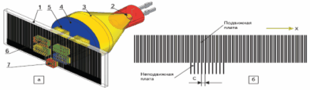 Измерительная головка датчика включает источник света, которым в отличие от лазерного интерферометра может быть любая лампа, чей свет проникает сквозь прорези малой фиксированной пластины-коллиматора, размещенной между лампой и подвижной пластиной (рис. 79а). Период прорезей и период линий подвижной пластины C согласованы (рис. 20б). Фотодетекторы, размещенные с другой стороны стеклянной пластины, определяют светопередачу устройства.