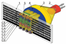 Рис. 22. Абсолютный линейный энкодер на основе интерферометрии Муара 1 — подвижная стеклянная пластина со строками линий с различными периодами C0–C6; 2 — лампа; 3 — линза; 4 — неподвижная пластина со строковыми прорезями; 5 — массив строковых фотодетекторов (для формирования четырех смещенных синусоидальных сигналов в строке).