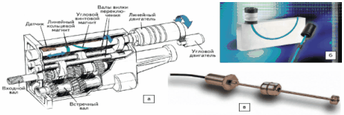 Принцип действия магнитостриктивного датчика линейного положения проиллюстрирован рис. 23г, д.