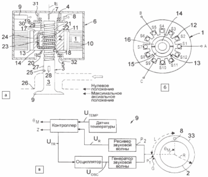 Рис. 26. Магнитостриктивный датчик положения клапана и/или ротора клапана двигателя внутреннего сгорания Ford Global Technologies: 1 — статор клапанной сборки; 2 — ротор; 3 — клапан; 4, 5 — подшипники; 6 — защитное ограждение; 7 — центрирующая пружина; 8 — вращающийся постоянный магнит для индикации углового положения ротора; 9 — магнитостриктивный датчик аксиального положения клапана 2 и/или углового положения ротора 1 электромеханической клапанной сборки; 10 — стек многослойного листового металла статора; 11 — центральное отверстие статора; 12 — обмотки статора; 13 — кольцевой магнит ротора; 14 — шаровая гайка; 15, 16 — сегменты магнита; 17 — цилиндрическая часть тела шаровой гайки; 18 — центральное отверстие шаровой гайки; 19, 20 — плечи для опоры; 21 — спиральная канавка цилиндрического тела; 22 — плоские участки — разделители спиральной канавки; 23 — возвратный канал для кольцевой прокатки примыкающих шаровых подшипников 24; 25 — апертура в головной части двигателя для установки клапанного штока; 26 — седло клапана; 27 — клапанный шток; 28 — антискручивающий волновод; 29 — спиральная канавка клапанного штока; 30 — плоские участки — разделители спиральной канавки клапанного штока; 31 — верхнее опорное плечо; 32 — отверстие для клапанного штока; E — ось вращения ротора (по часовой стрелке или против часовой стрелки); 33 — звуковой канал радиусом R; G — зазор в звуковом канале; θM — детектируемое угловое положение; L — соответствующая длина пути; UOSC , UTEMP , UTR , UR — сигналы напряжения; P1 , P2 — точки схемы (с нулевой длиной проводника); Z — детектируемое аксиальное положение